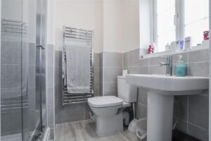 UPVC double glazed window, central heated towel rail, Dual flush WC, pedestal wash basin with mixer tap, double main feed shower, part tiled elevations, wood effect floor.